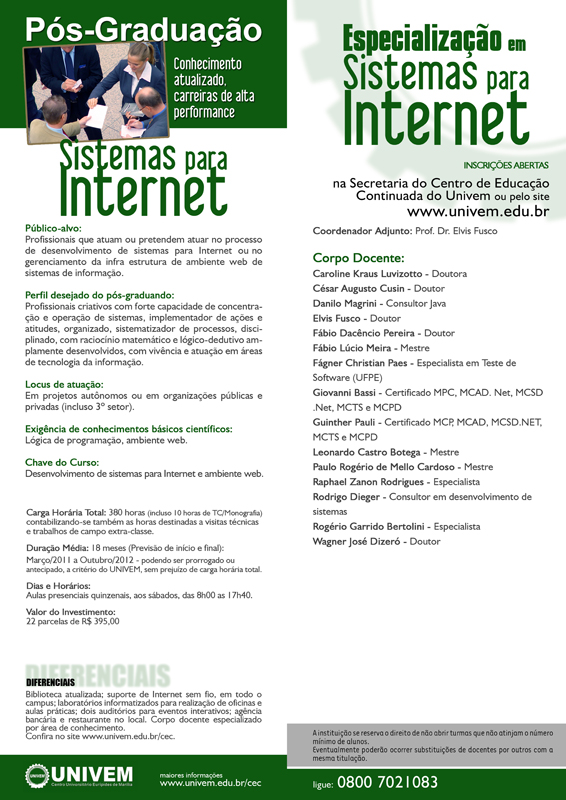 O UNIVEM por meio de Centro de Educação Continuada (CEC) está com inscrições abertas para cursos de pós-graduação lato sensu (Especialização / MBA). Na área de TI será oferecido no início de 2010 turma para o curso de Especialização em Sistemas para Internet.