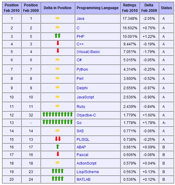 Abaixo segue a lista de linguagens de fevereiro de 2010 em comparação com fevereiro de 2009.