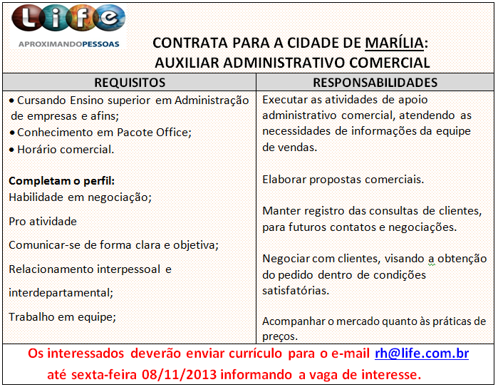 > Uncategorized > Life tem vagas para Auxiliar Administrativo e Consultor de Negócios