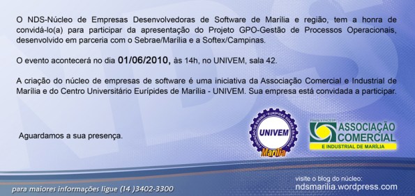 O Núcleo de Empresas Desenvolvedoras de Software de Marília e Região (NDS) fará a apresentação do projeto GPO – Gestão de Processos Operacionais, no dia 01/06/2010 às 14:00hs no Centro Universitário Eurípides de Marília (UNIVEM).