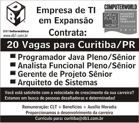 A unidade de Curitiba está trabalhando em parceria com uma fábrica de software de uma reconhecida multinacional financeira, na mesma cidade, e estamos com uma demanda de contratação muito grande, devido a grandes