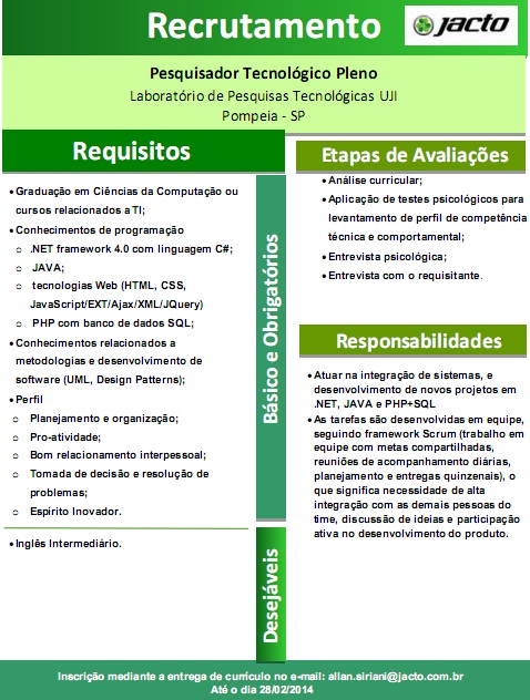Jacto contrata Pesquisador Tecnológico Pleno